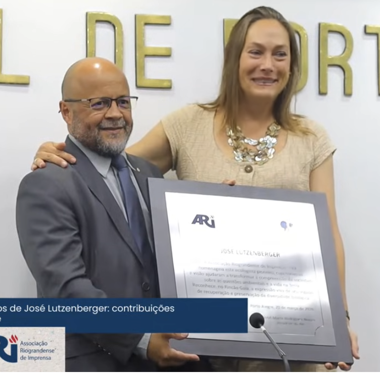 José Nunes entrega Placa em homenagem a José Lutzenberger para Lara J. W. Lutzenberger - José Nunes, presidente da ARI – Associação Riograndense de Imprensa – Homenagem a José Lutzenberger – Entrega de placa